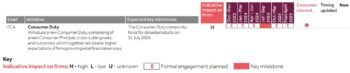 As seen in the example above, the UK Regulatory Initiatives Grid considers the potential impact of a legislative change on financial firms, details when formal engagements are planned, and specifies when a change will come into effect. The Grid also shows whether the initiative is likely to be of interest to consumers and/or consumer organisations. This may be because an initiative is expected to have a direct impact on retail consumers.