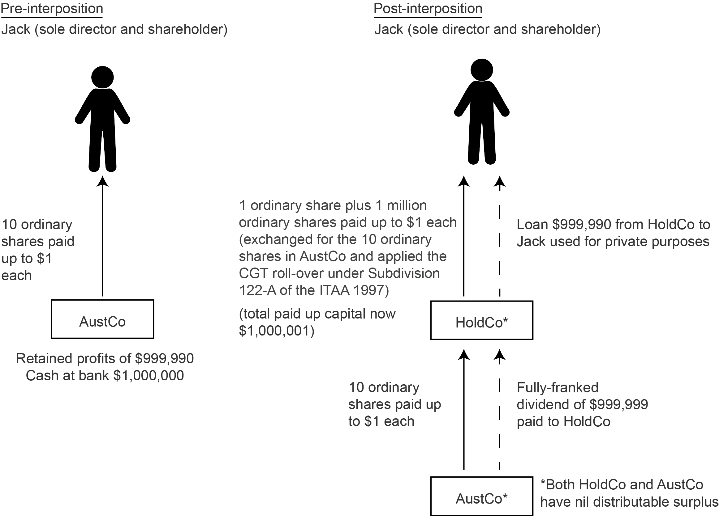 The circumvention of Division 7A in the above scenario occurs by virtue of the restructure resulting in both ‘AustCo’ and ‘HoldCo’ not having a ‘distributable surplus’. With no ‘distributable surplus’, Division 7A will not apply to deem a dividend to Jack in respect of the “non-complying Division 7A loan” he receives under the arrangement.