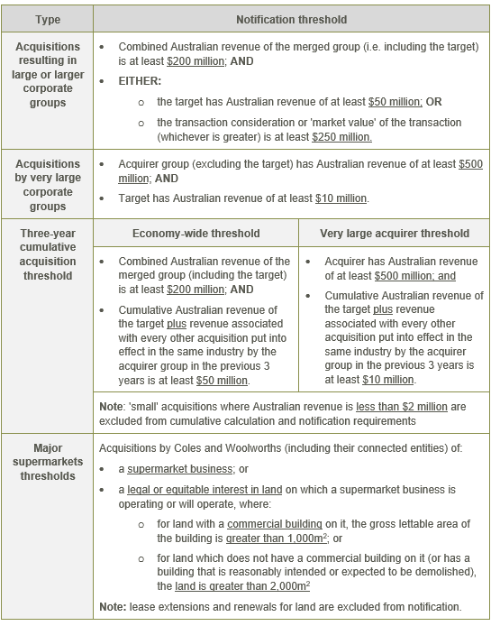 - The 6 month transition period to the new mandatory ACCC merger notification regime (Mandatory Notification Regime) commenced on 1 July 2025. During this period, if parties enter into a transaction that will meet the notification thresholds and complete on or after 1 January 2026: