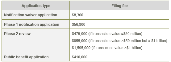 The Determination sets out the following filing fees for the Mandatory Notification Regime, which are significant and have the potential to impact the commerciality of some smaller to medium sized deals, particularly if a Phase 2 merger review is required: